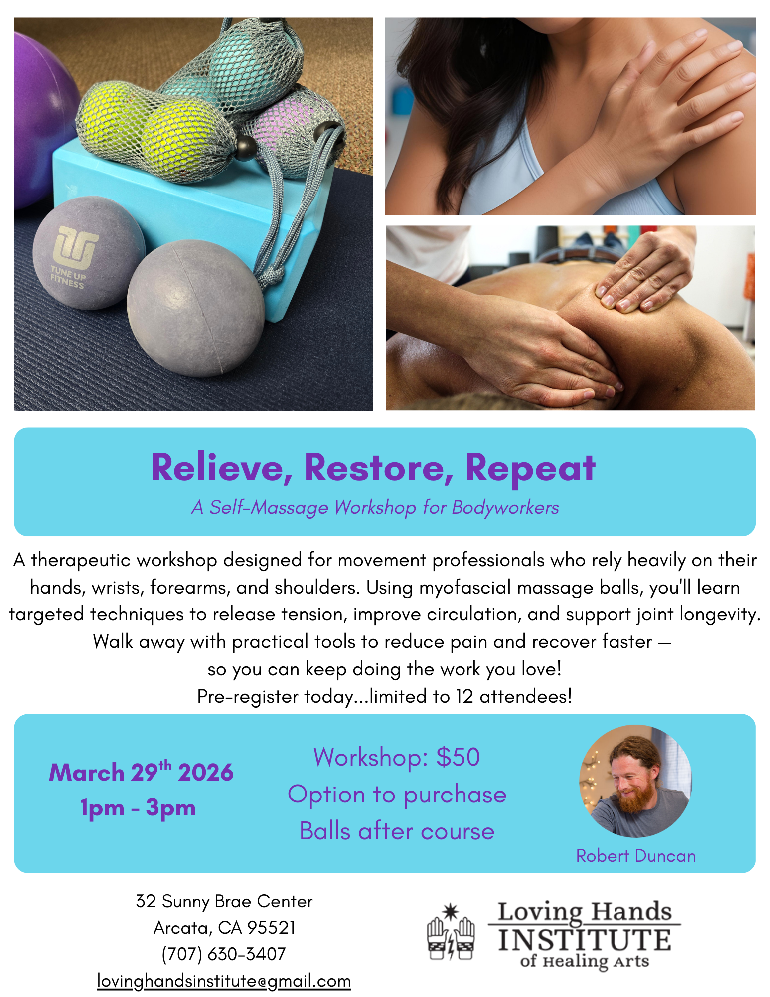 NOTE: This event is held at Loving Hands Institute of Massage. Please contact them directly to register for this workshop. Phone: 707-630-3407