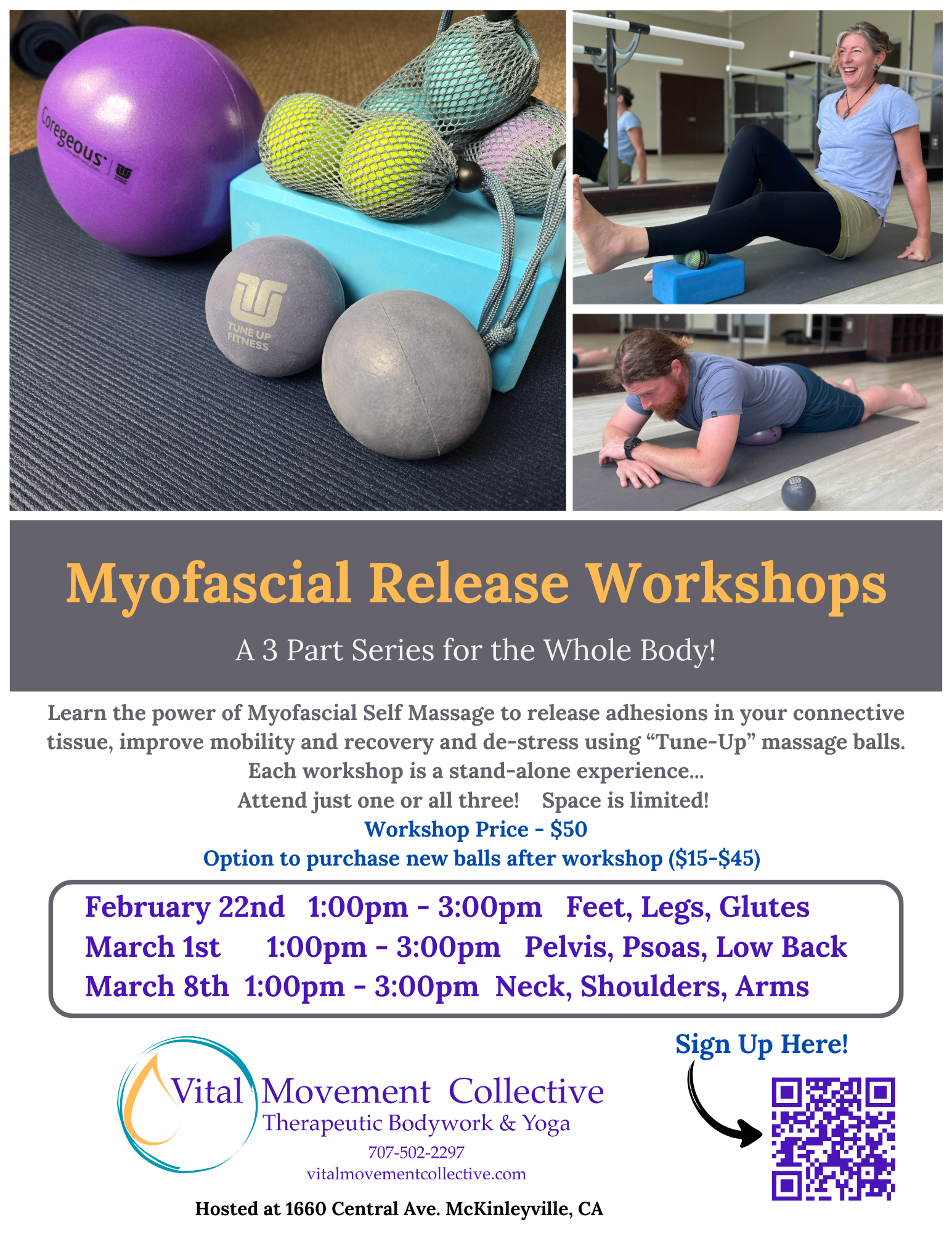 Learn the power of Myofascial Self Massage to release adhesions in your connective tissue, improve mobility and de-stress using “Tune-Up” massage balls! Each workshop is a stand-alone experience...attend just one or all three!